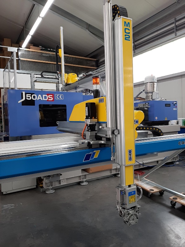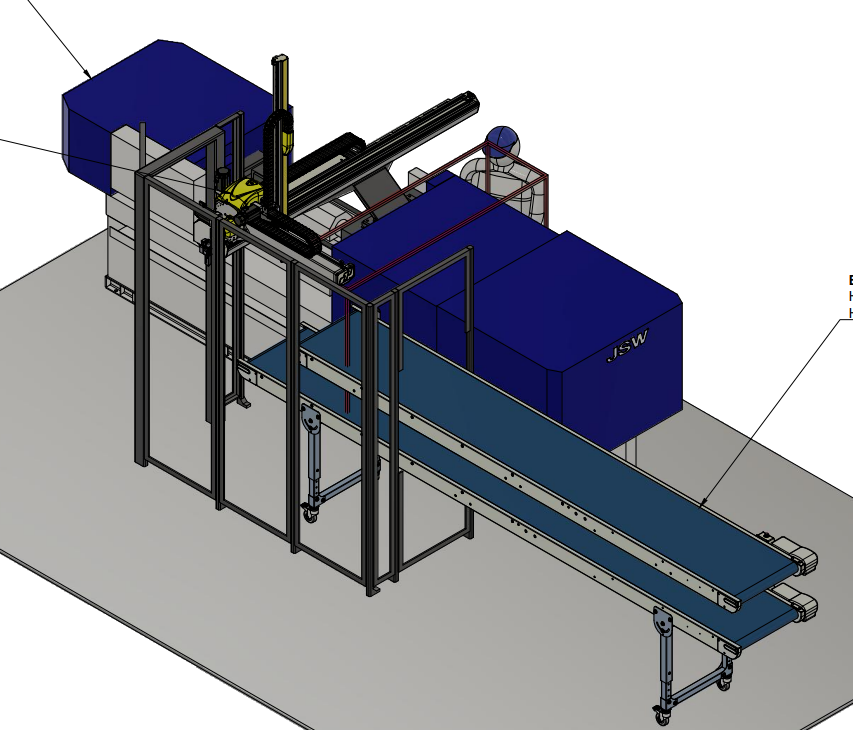 An unserer vollelektrischen 50t JSW Maschine wurde von ProOptima eine komplette Automatisierungszelle mit Roboter und Vereinzelung von Metalleinlegeteilen installiert und angefahren.