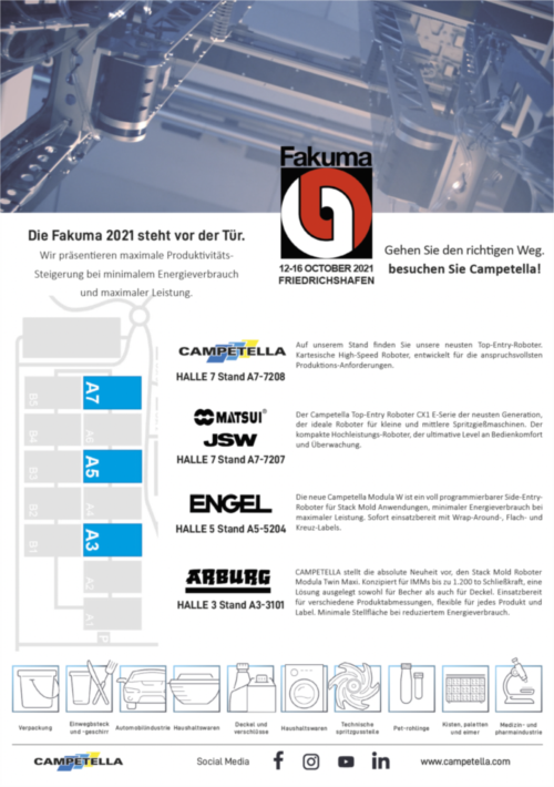 Campetella war mit einigen verketteten Automatisierungen bei namhaften europäischen Spritzgussmaschinenherstellern zu sehen.
